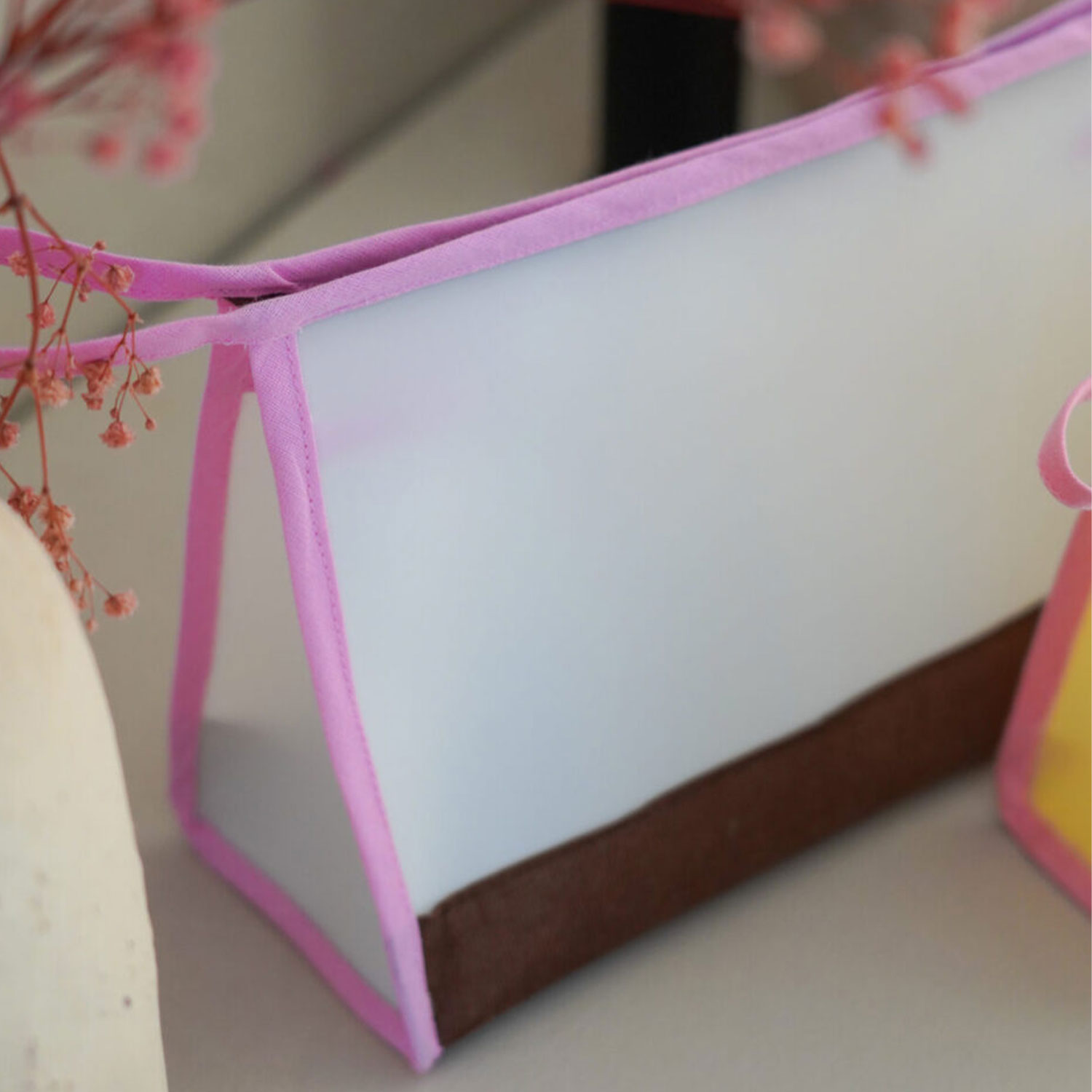 Kürze die Kante des Seitenteils (nur das Jelly Vinyl) um 2 bis 3 mm. Falte das Schrägband um die Oberkante, stecke es fest und nähe es 2 mm vom Rand entfernt fest. Beim zweiten Taschenteil wiederholest du diesen Arbeitsschritt.