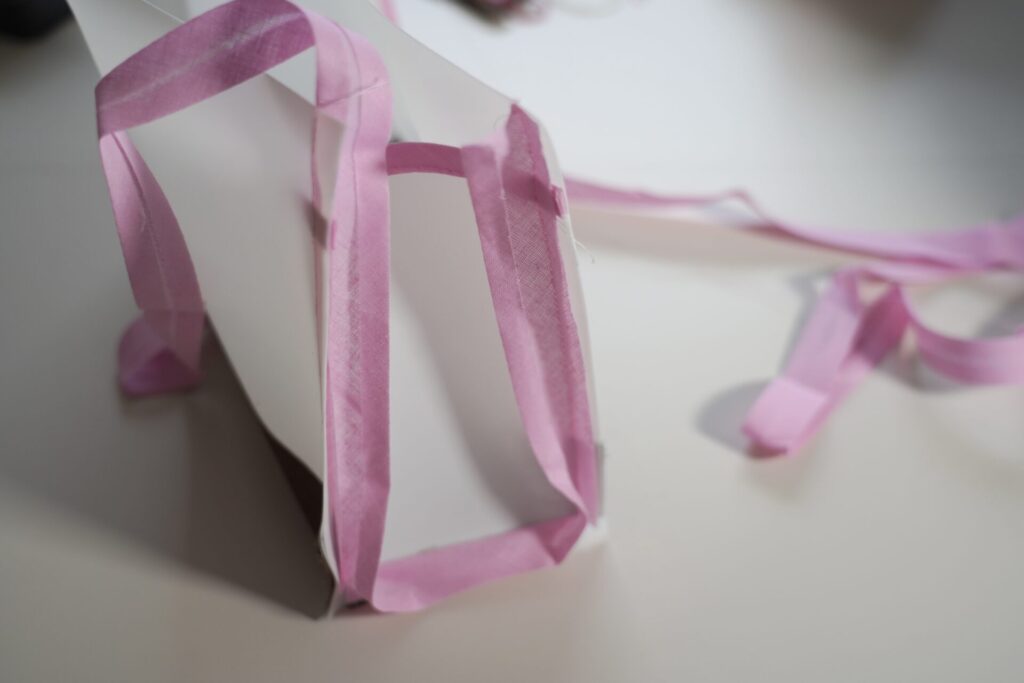 Hinweis: Dieser Schritt kann an den Ecken etwas knifflig sein. Nimm dir Zeit und nähe gegebenenfalls in zwei Schritten, falls sich das Schrägband schwer falten lässt.