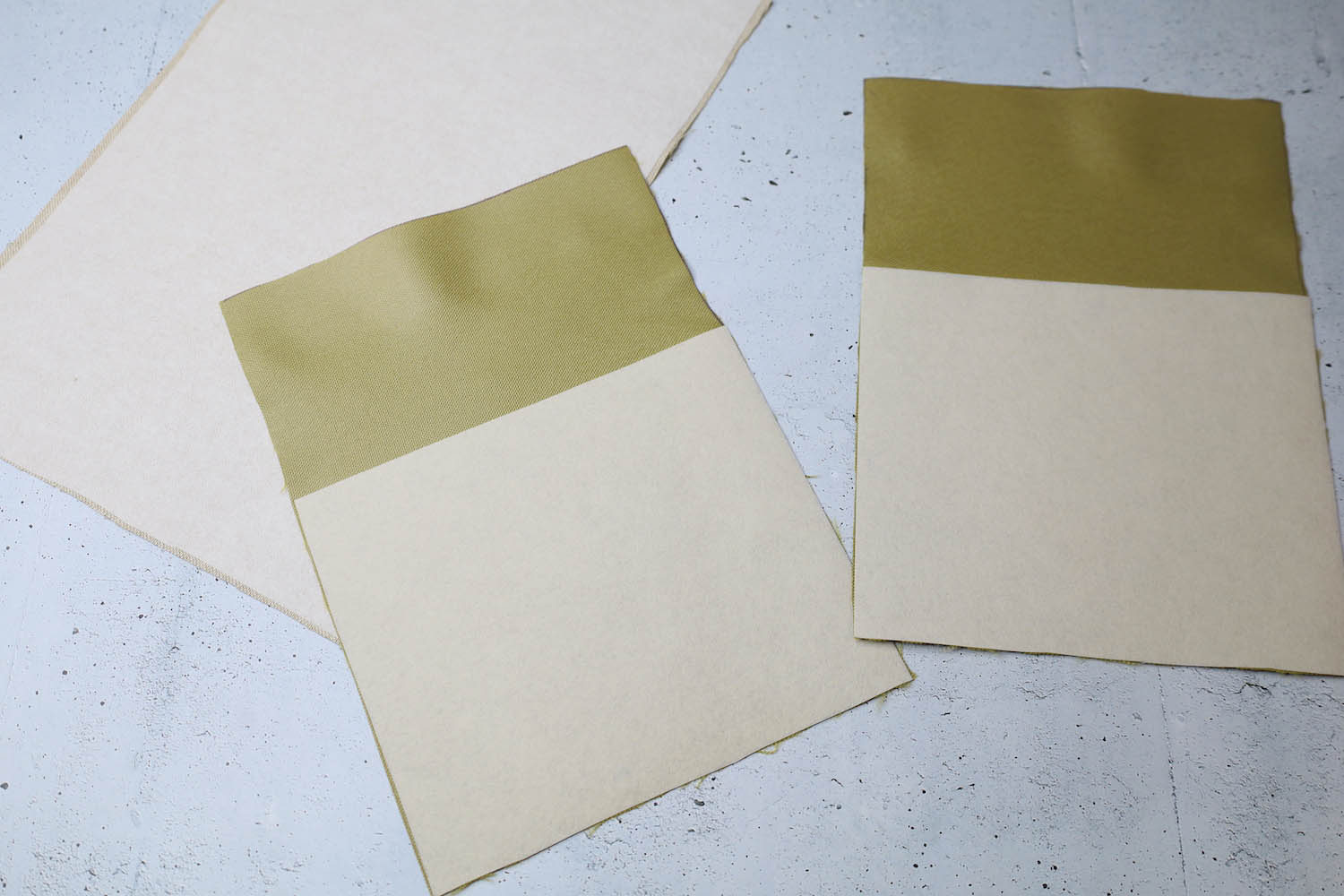 Fixiere die Manschette mit Hilfe von Wondertape und/oder Klammern so auf dem unteren Mäppchen, das dessen Oberkante knapp verdeckt wird. Die Seitennähte von Mäppchen und Manschette treffen jeweils aufeinander, die Gurtbänder liegen mittig über den Seitennähten des Mäppchens.